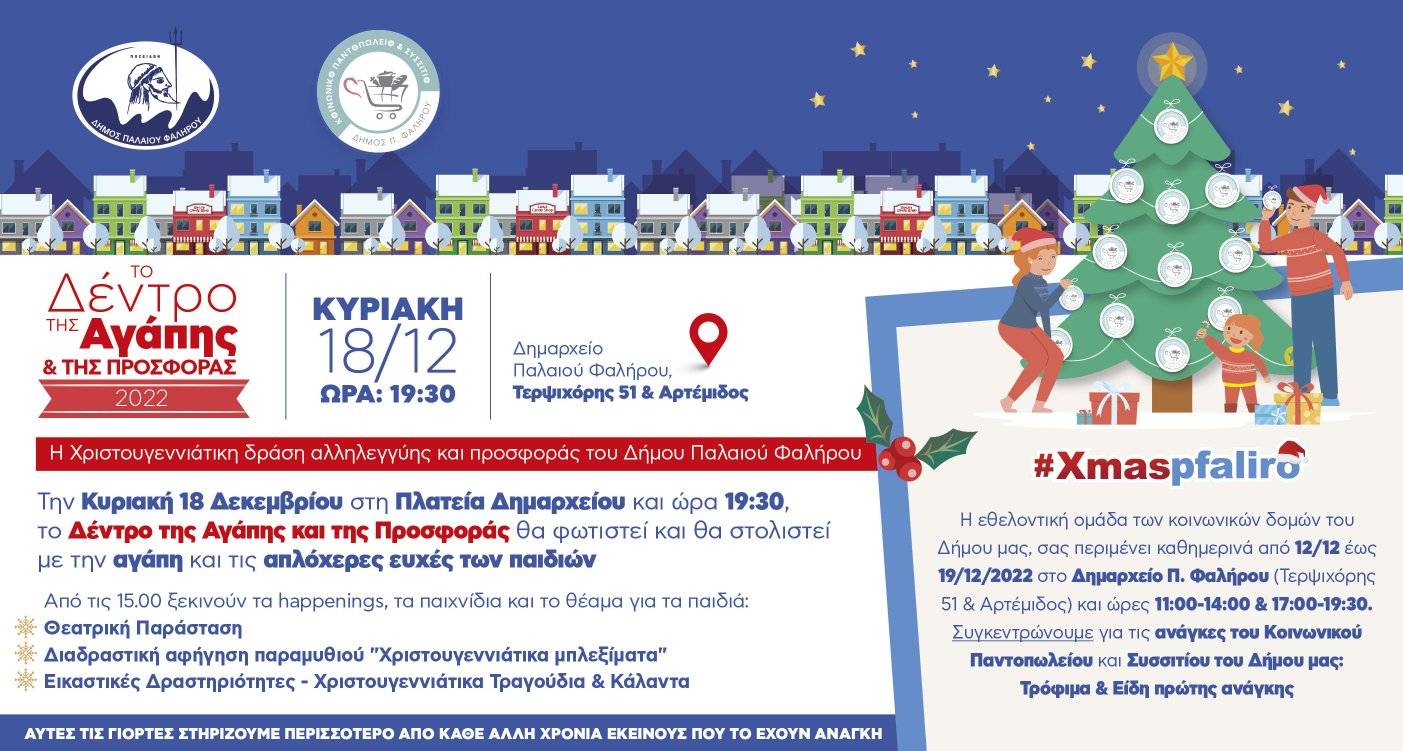 Ο Δήμος μας με πρωτοβουλία του Δημάρχου Παλαιού Φαλήρου Γιάννη Φωστηρόπουλου, διοργανώνει και φέτος την σημαντική δράση αλληλεγγύης και προσφοράς «Το Δέντρο της Αγάπης και της Προσφοράς», η οποία θα πραγματοποιηθεί από τις 12/12 έως 19/12 στον προαύλιο χώρο του Δημαρχείου Παλαιού Φαλήρου.