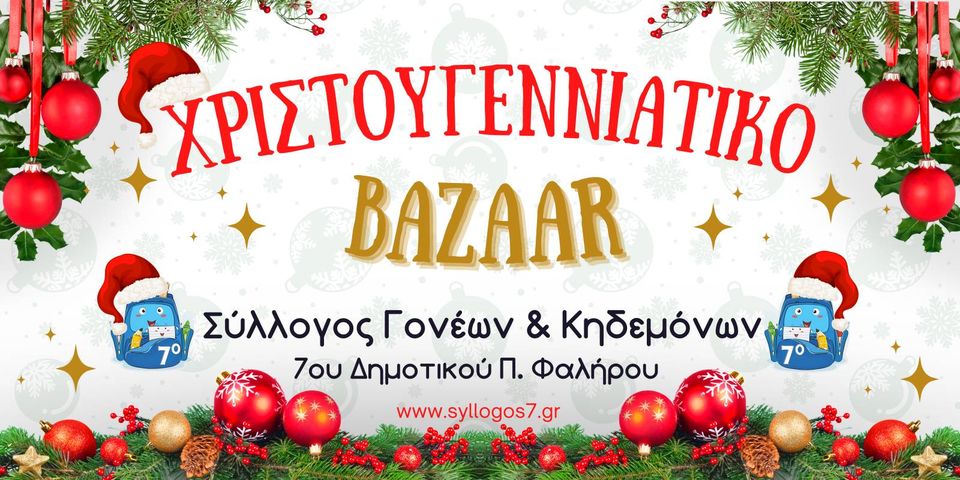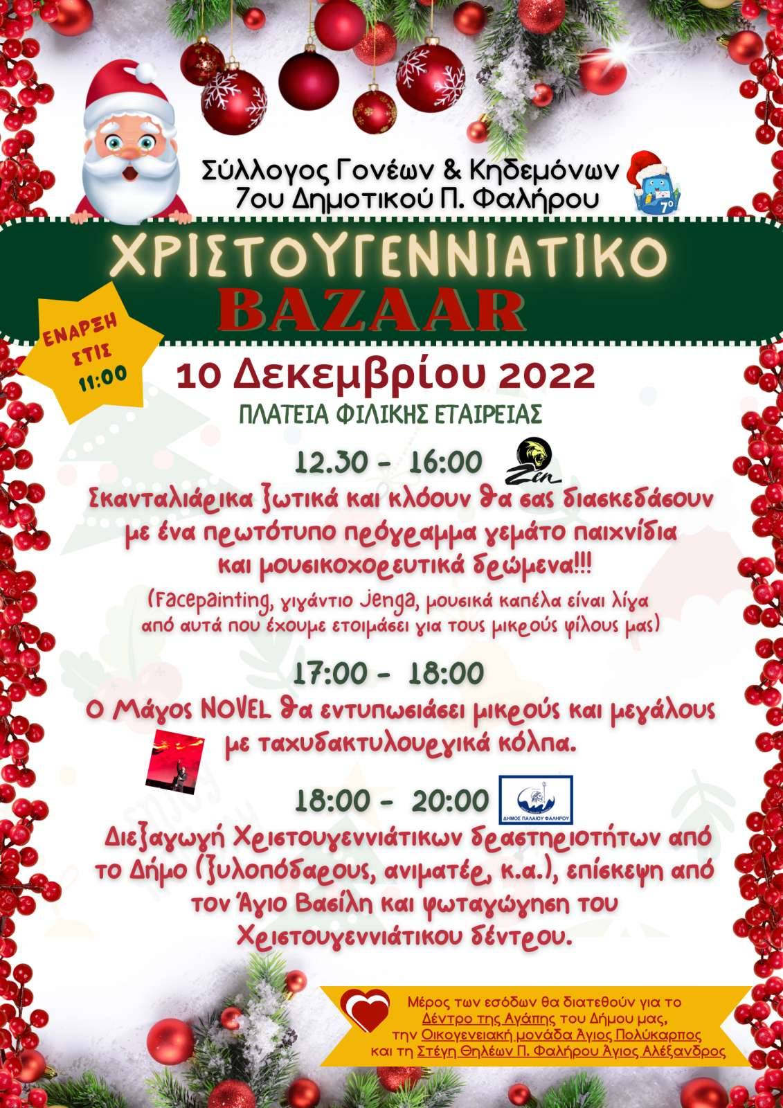 ”Με μεγάλη μας χαρά σας προσκαλούμε να συνδράμετε στο υπαίθριο Χριστουγεννιάτικο Μπαζάρ του Συλλόγου Γονέων και Κηδεμόνων του Σχολείου μας, το οποίο θα διεξαχθεί και φέτος στην πλατεία Φιλικής Εταιρείας το Σάββατο στις 10 Δεκεμβρίου. Ο σκοπός του Μπαζάρ μας είναι αφενός φιλανθρωπικός, ώστε να συνεισφέρουμε στο Κοινωνικό Παντοπωλείο του Δήμου μας & σε ορφανοτροφεία με τρόφιμα και αφετέρου να καλύψουμε τις ανάγκες που έχει το σχολείο μας!